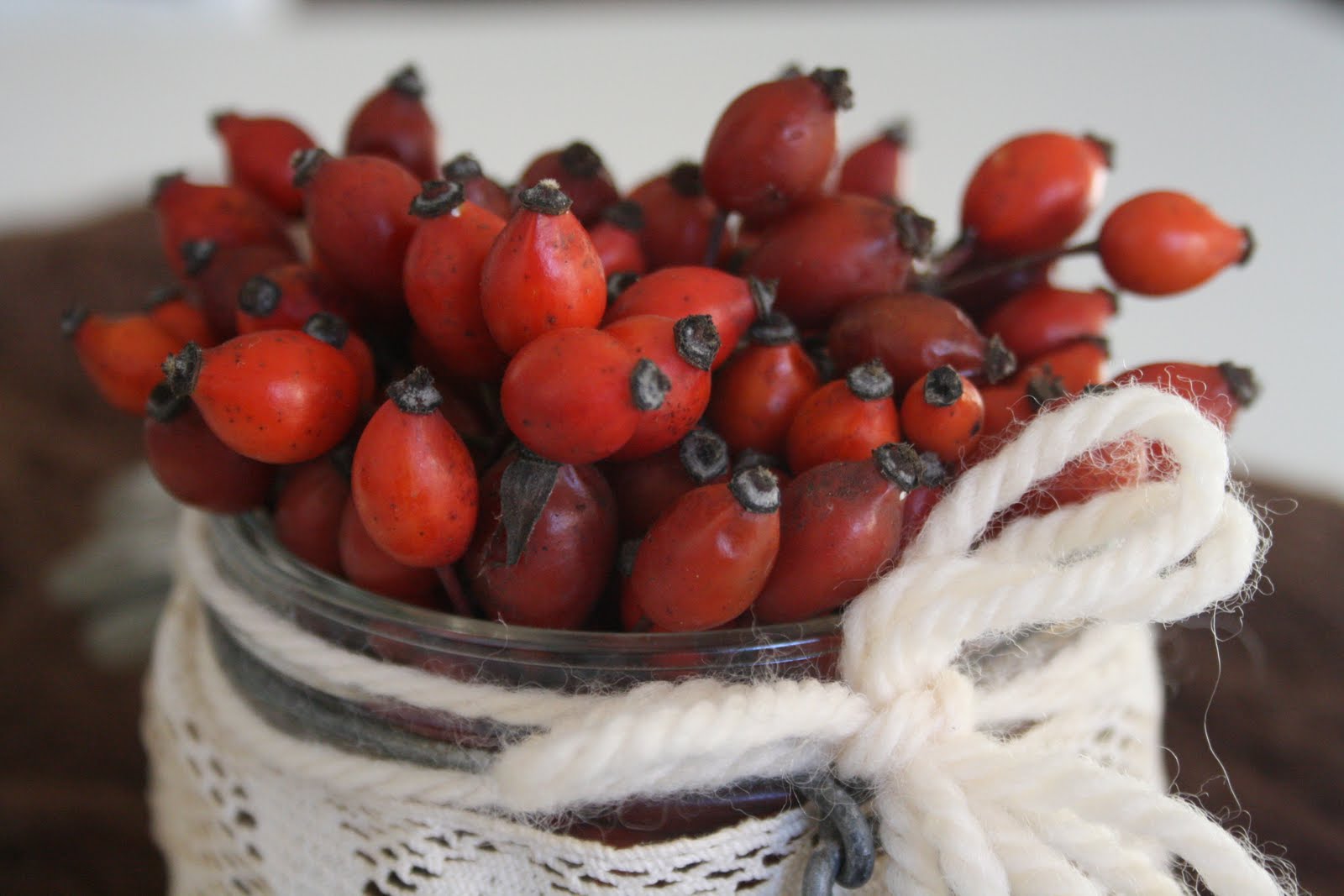 * Per il terzo progetto occorre: un barattolo di vetro, un pezzo di pizzo lungo più o meno quanto la circonferenza del barattolo, un filo spesso di lana bianca, bacche di rosa canina.